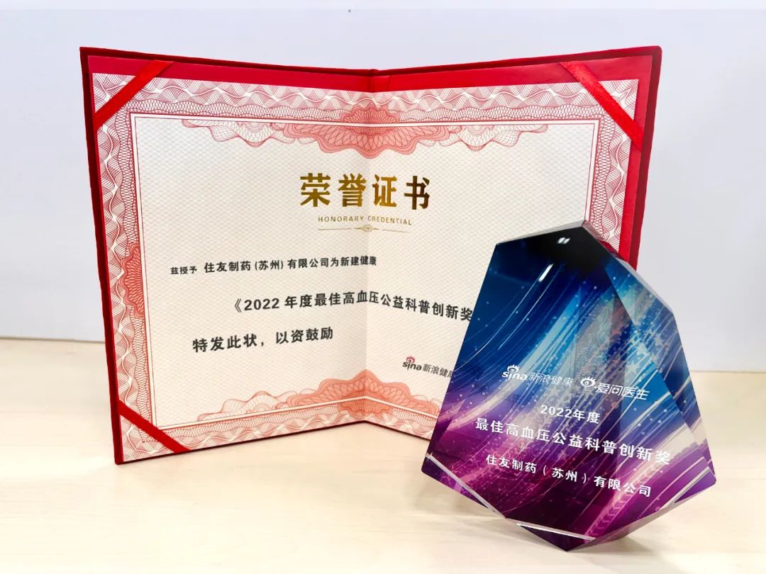2023年1月,住友制药荣获由新浪健康颁布的“2022年度最佳高血压公益科普创新奖”。本奖项旨在颁发给2022年度在创新医疗健康领域做出卓越贡献的企业或机构,由新浪健康经过多方考察以及层层筛选,奖项囊括公益科普、科普媒体、科普机构、科普达人、最佳栏目、科普营销等各个领域。