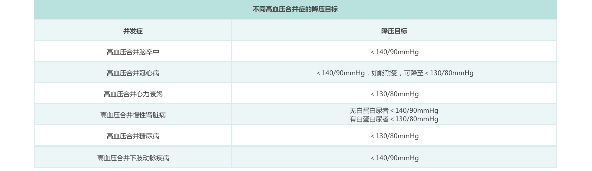 高血压强调早发现、早治疗,一旦被诊断为高血压即需开始降压治疗。高血压治疗的总体治疗原则:治疗性生活方式、降压药物治疗、多重心血管危险因素的协同控制、不同患者人群分别设定合适的降压目标(如下表[5])。
