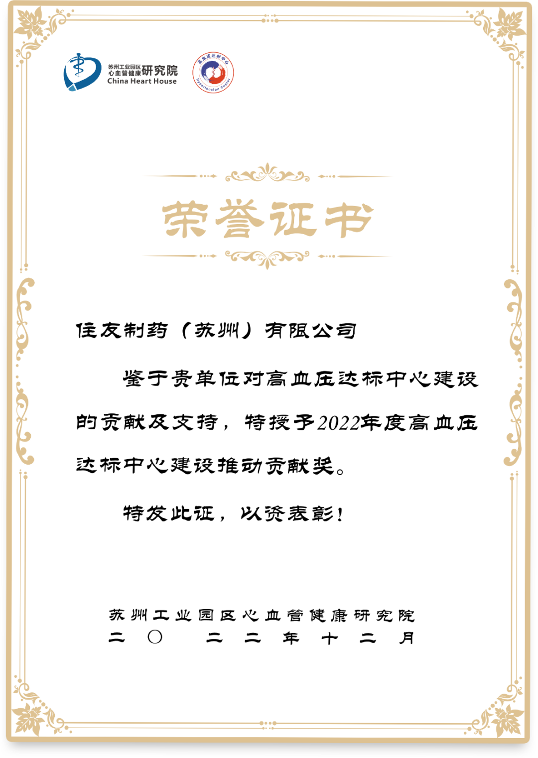 2022年12月,住友制药荣获由中国医疗保健国际交流促进会心血管疾病预防与治疗分会、中国医疗保健国际交流促进会高血压分会、心血管健康联盟、苏州工业园区心血管健康研究院联合共同发起的高血压达标中心颁布的“年度高血压达标中心推动贡献奖”。