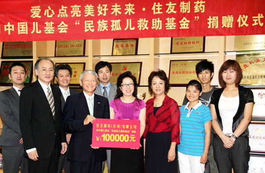 新学期即将来临,来自纳西族、白族、彝族、普米族、傈僳族、藏族等十多个民族孤儿上学问题再次牵动社会爱心人士的心。近日,由中国儿童少年基金民族孤儿救助基金发起,中国儿基会、我司大力支持的主题为“爱心点亮美好未来,援孤助学行动”在京正式启动,这是继2009年爱心援孤系列行动后的又一公益善举,活动旨在带动更多的企业参与爱心行动,唤起更多的社会爱心人士共同关心民族孤儿和弱势群体的成长和教育,支持慈善事业助力爱心传递。会上Sumitomo Dainippon Pharma Co., Ltd.社长多田正世代表住友制药向云南丽江孤儿学校捐赠了十万元救助善款,该善款将用于帮助民族孤儿继续完成学业。